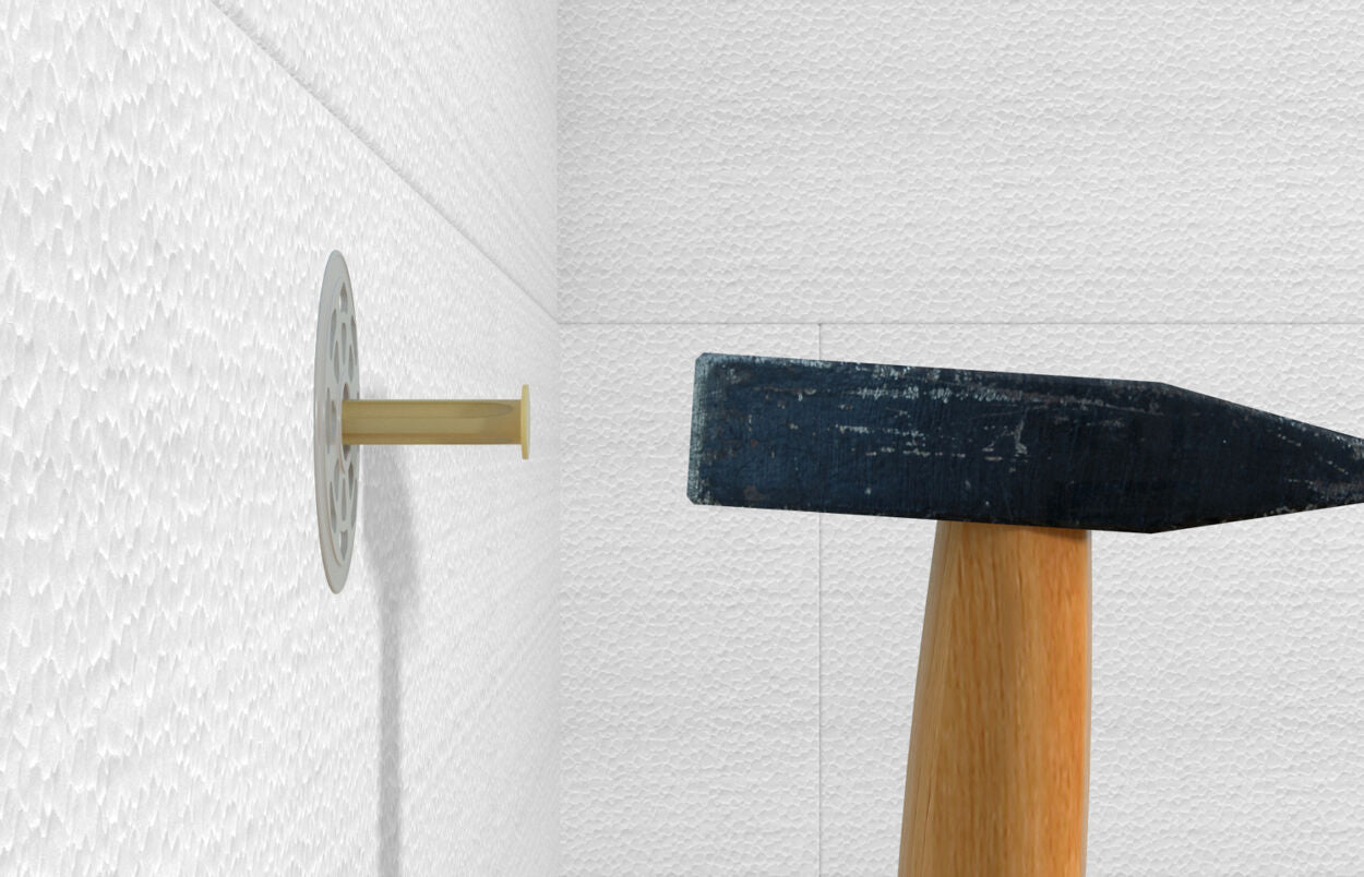 El tope de martillo integrado evita que la fijación se expanda prematuramente, lo que permite una instalación sin problemas. El clavo de plástico reforzado con fibra de vidrio reduce la transmisión de calor y evita marcas en la superficie del yeso.