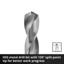- 5 brocas para metal (diámetros de 2, 3, 4, 5 y 6 mm): Fabricadas en acero HSS forjado en caliente con punta dividida de 135°, lo que permite perforaciones precisas sin deslizamientos y aumenta la velocidad de trabajo.