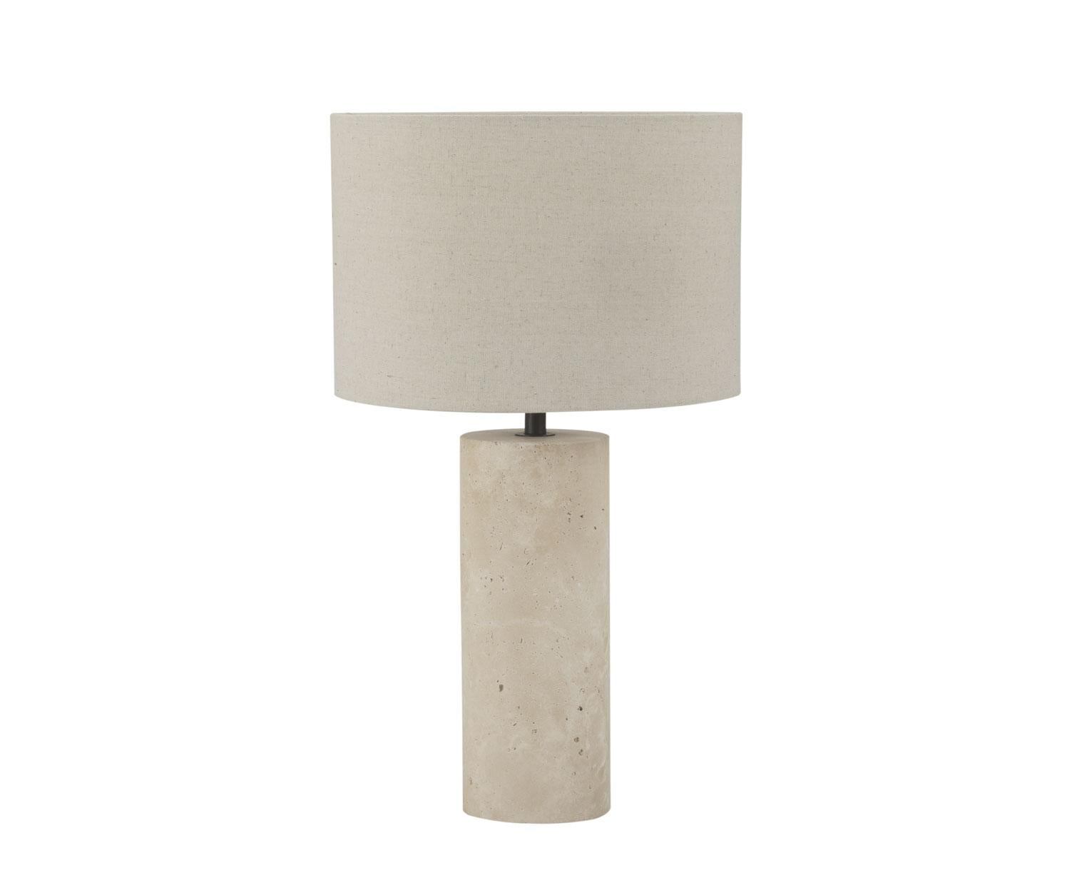 - Natural and noble materials: travertine body that adds weight and texture, combined with a linen shade that softens the lighting.