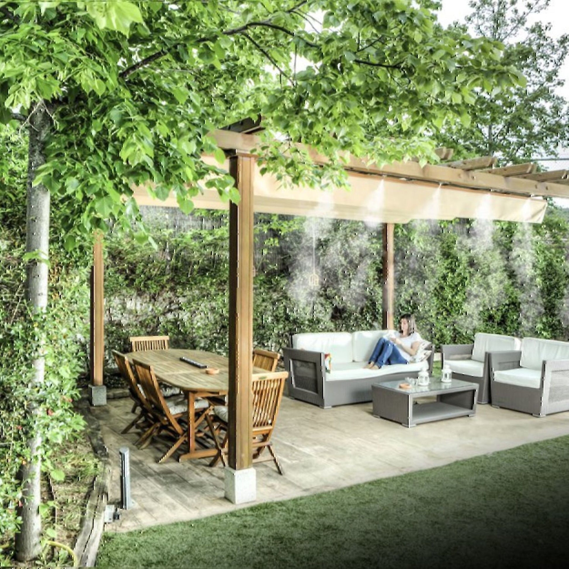 • Easy-to-install misting system for air conditioning outdoor spaces up to 75 m2. Natural cooling with very low noise levels, capable of reducing ambient temperature by up to 12°C.