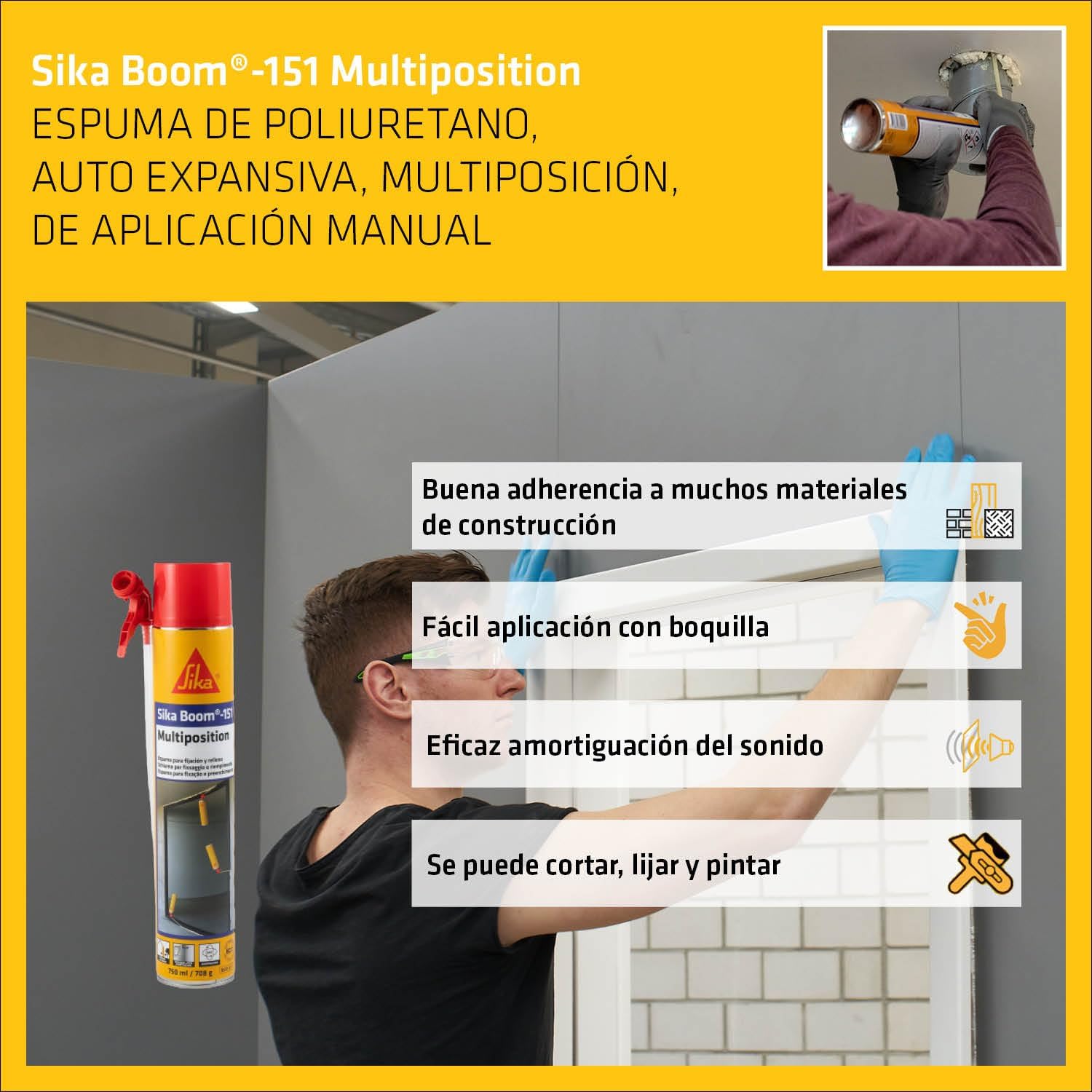 Sika Boom‑151 Multiposition is a manual application, self-expanding, one-component polyurethane foam designed for fixing, filling, and insulating cavities and joints in construction. Its formulation with a safety valve allows for application in any position (360°) without compromising its performance, facilitating work in hard-to-reach spaces.